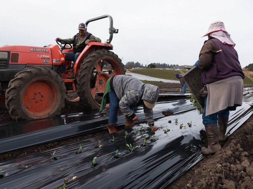 Magaña Organic Farms owner Bertha Magaña (right) and her employees plant kale on her land in Prunedale.";