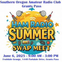 The Southern Oregon Amateur Radio Club is holding its summer swap meet on Saturday, June 1, 2025 from 9:00 AM to 3:00 PM in the parking lot of the Fruitdale Grange, 1440 Parkdale Drive in Grants Pass.