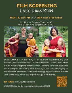 LOVE CHAOS KIN (98 min) is an intimate documentary that follows white-presenting, Navajo-descent twins and their South Asian adoptive parents over 12 years. The film captures their complex reckoning with identity, race, and belonging as the children reconnect with their struggling white birth mother and, eventually, their estranged Navajo birth father.