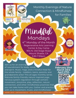 Join Regenerative Arts Learning Center & Day Camp (RadCamp), First 5 Siskiyou and Mount Shasta Bioregional Ecology Center (MSBEC) for a series of Mindful Mondays for families of all ages. Join us for an evening of nourishment for body, mind, and spirit. Music, Yoga, and a