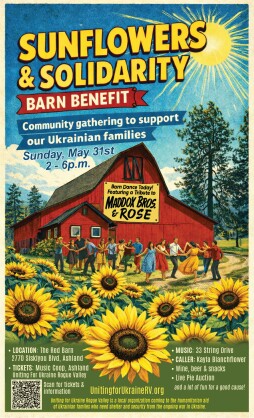 Tickets for Sunflowers and Solidarity Barn Benefit are $50 and can be purchased at Music Coop at 268 E. Main St, Ashland or online at UnitingforUkraineRV.org