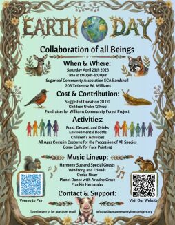The Williams annual Earth Day celebration will be on Saturday, April 25, 2026 at the SCA in Williams from 1-6pm, with live drumming starting at 12:30pm.