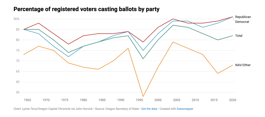 Overall, more eligible voters are casting ballots, however. Horvick said the turnout rates indicate a healthy state of democracy in Oregon, though in surveys, residents indicate a growing disillusionment about government and elections.