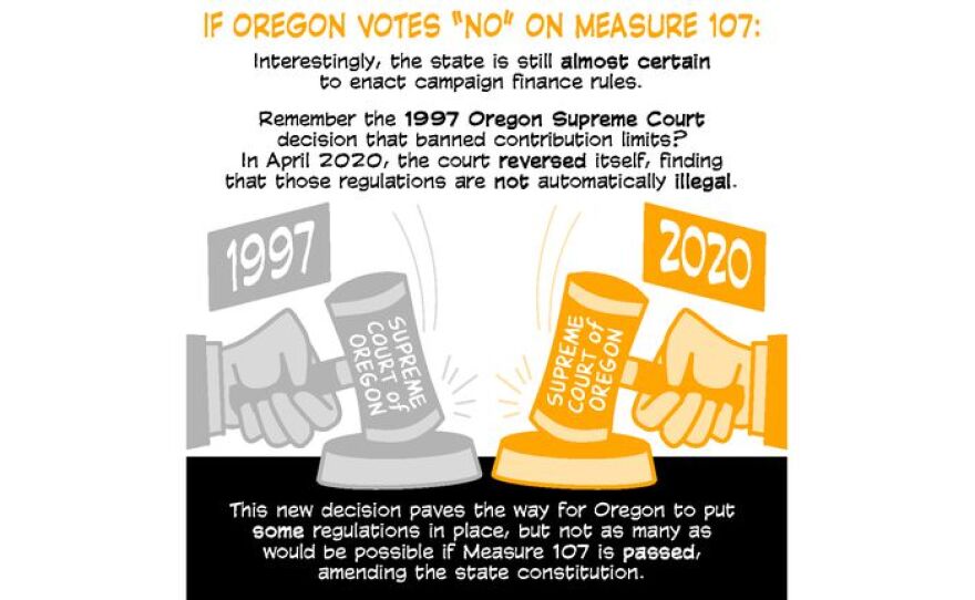 The court’s ruling does not go as far as Measure 107, meaning campaign finance rules would likely be more narrow — and potentially more vulnerable to legal challenges — if the measure doesn’t pass.
