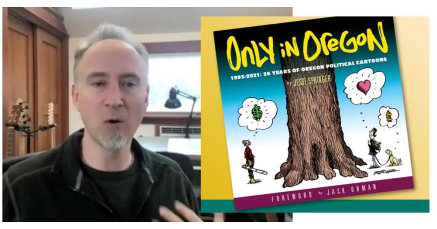 That would be Only in Oregon 1995 - 2021: 26 Years of Oregon Political Cartoons. Spotted owls, loggers, deadheads, Duck fans, and Keiko the killer whale all make appearances in the book.